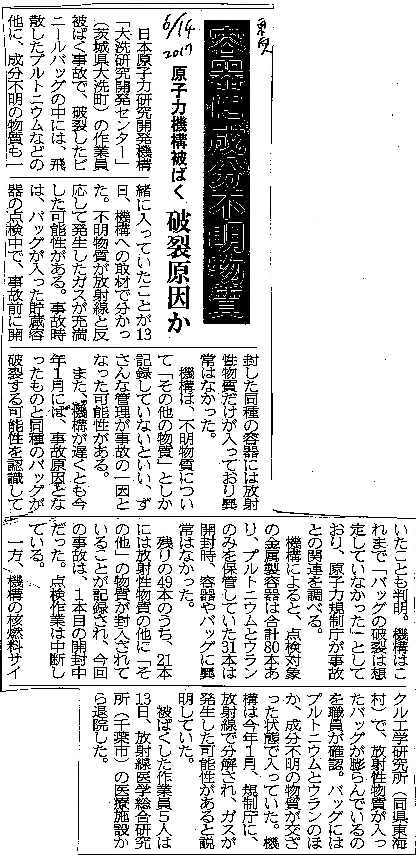 [2017_06_14_07]容器に成分不明物質 原子力機構被ばく 破裂原因か(東奥日報2017年6月14日)