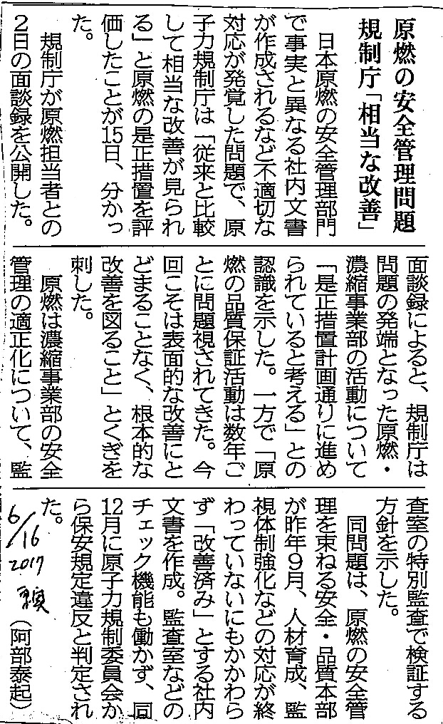 | [2017_06_16_03]原燃の安全管理問題 規制庁「相当な改善」(東奥日報2017年6月16日) |