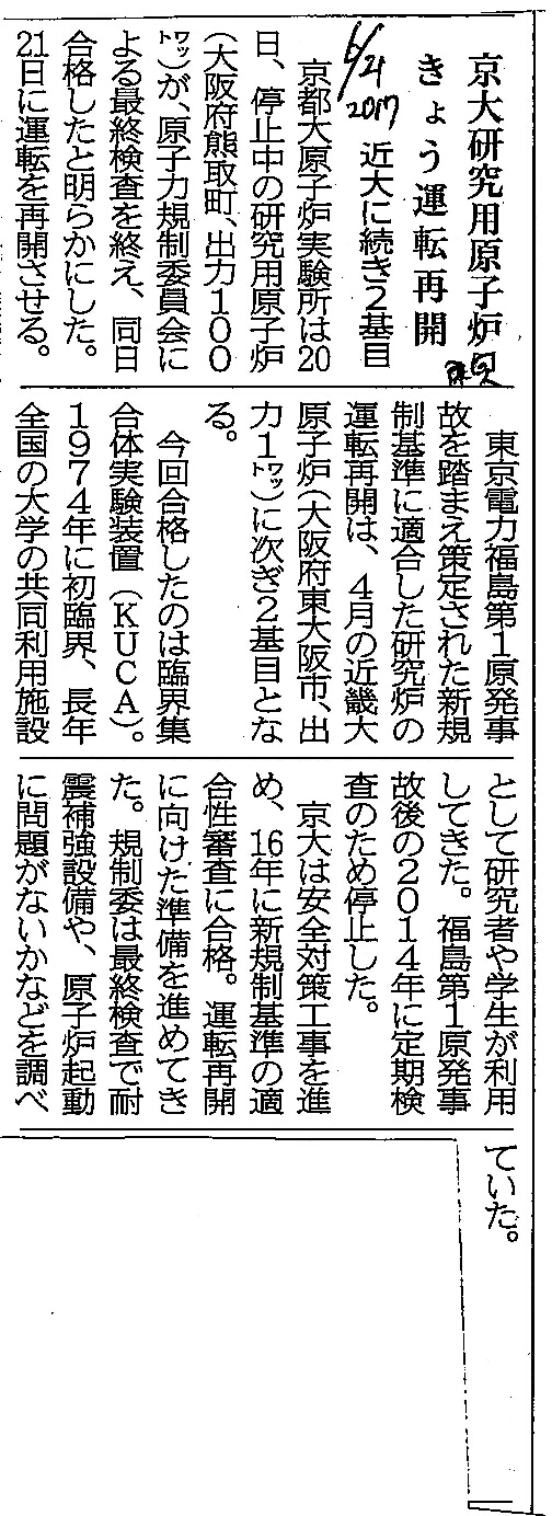 [2017_06_21_07]京大研究用原子炉きょう運転再開 近大に続き2基目(東奥日報2017年6月21日)