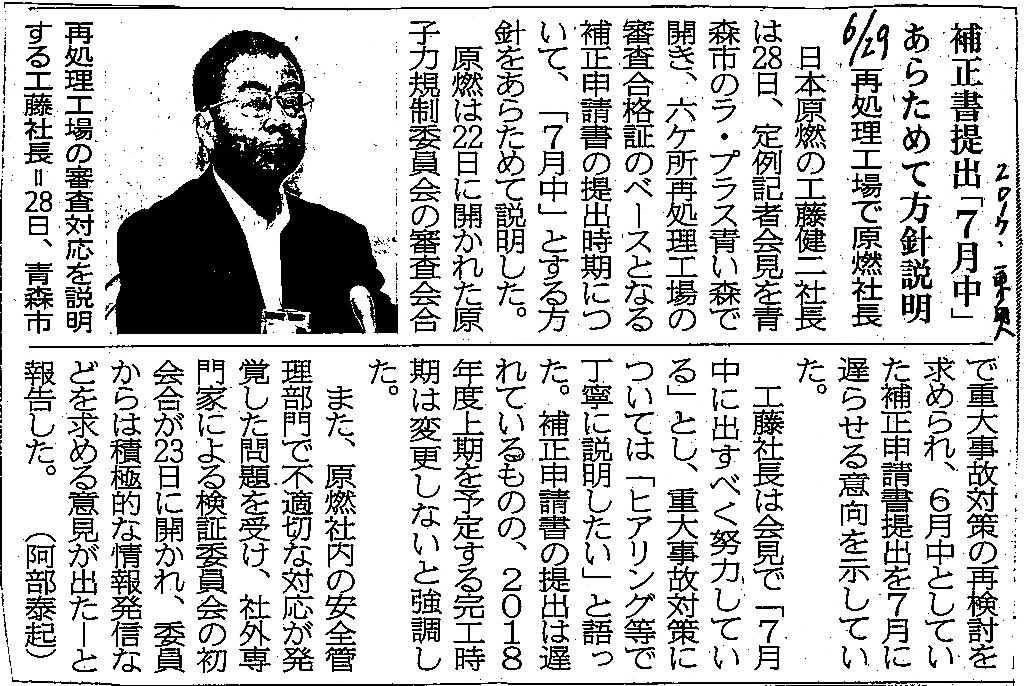 | [2017_06_29_02]補正書提出「7月中」あらためて方針説明 再処理工場で原燃社長(東奥日報2017年6月29日) |