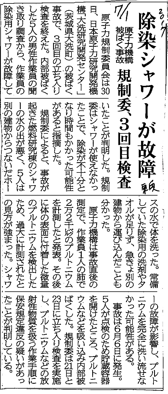 [2017_07_01_02]除染シャワーが故障 原子力機構被ばく事故 規制委、3回目検査(東奥日報2017年7月1日)