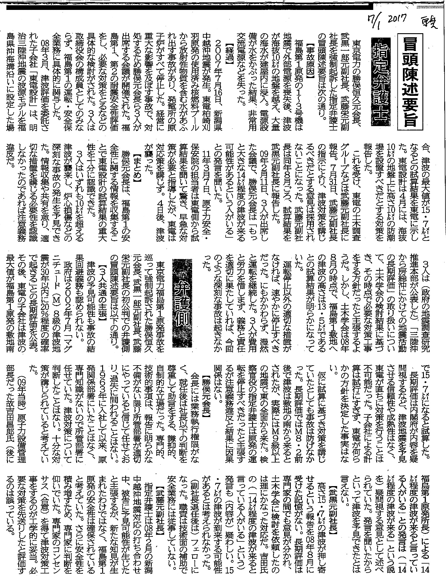 [2017_07_01_03]冒頭陳述要旨 東京電力の勝俣恒久会長・武黒一郎副社長・武藤栄元副社長を強制起訴 指定弁護士 弁護側(東奥日報2017年7月1日)