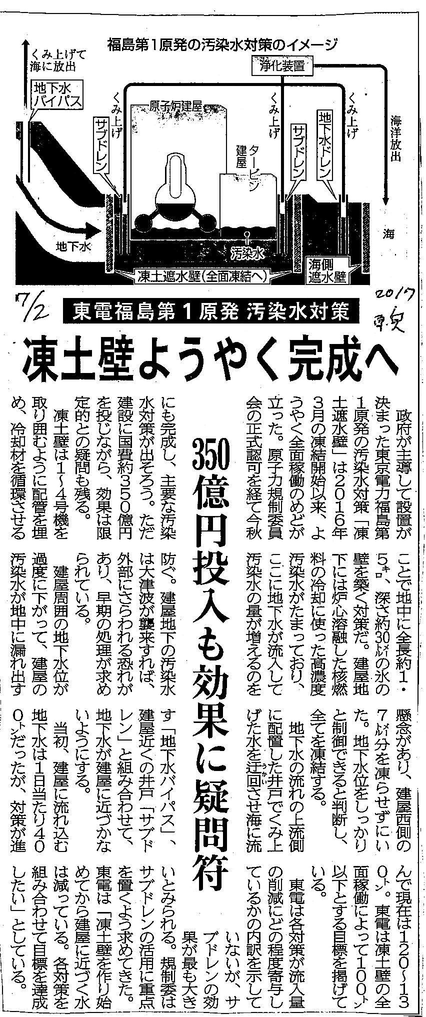 | [2017_07_02_01]東電福島第1原発 汚染水対策 凍土壁ようやく完成へ 350億円投入も効果に疑問符(東奥日報2017年7月2日) |