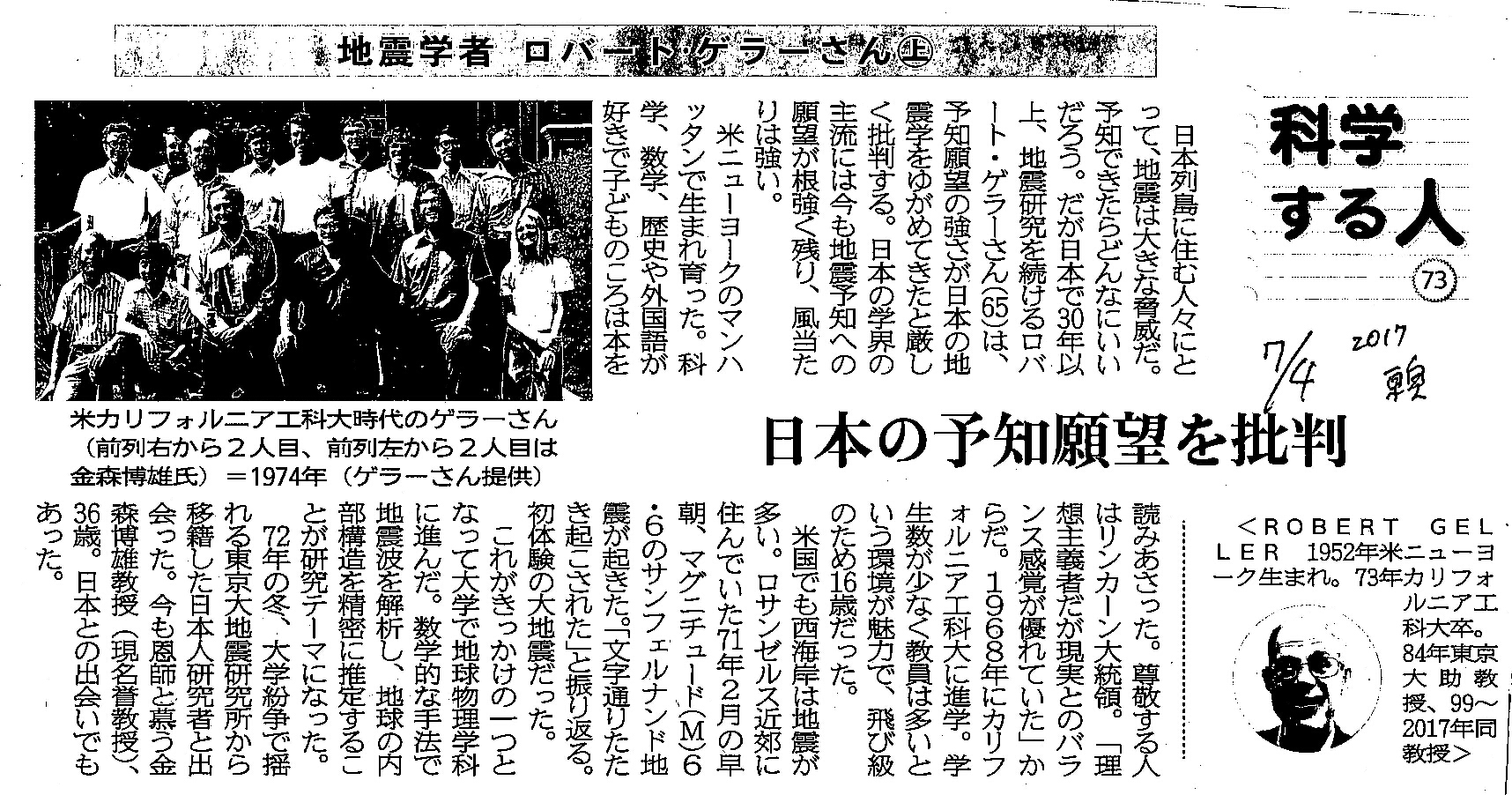 [2017_07_04_04]科学する人73 地震学者ロバート・ゲラーさん(上) 日本の予知願望を批判(東奥日報2017年7月4日)