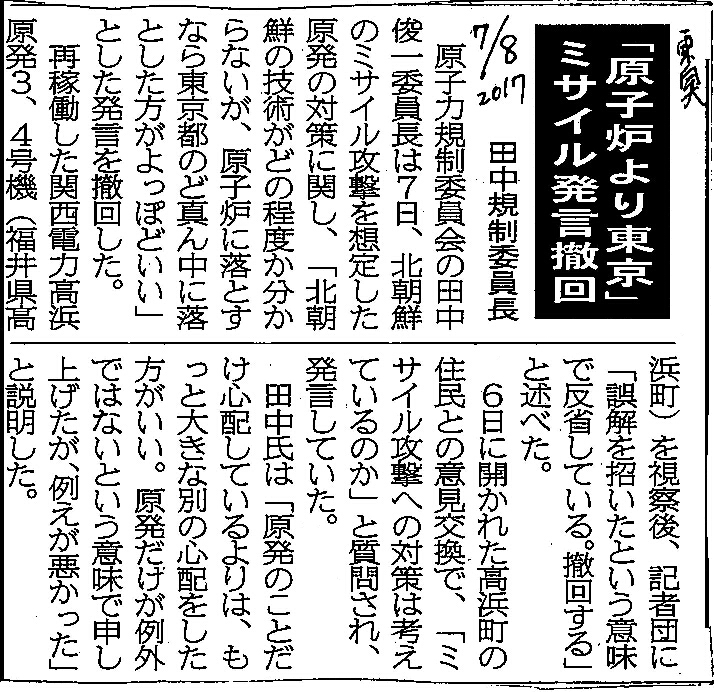 [2017_07_08_02]「原子炉より東京」ミサイル発言撤回 田中規制委員長(東奥日報2017年7月8日)