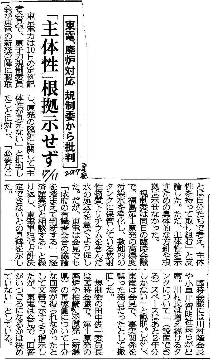 | [2017_07_11_03]東電、廃炉対応 規制委から批判 「主体性」根拠示せず(東奥日報2017年7月11日) |