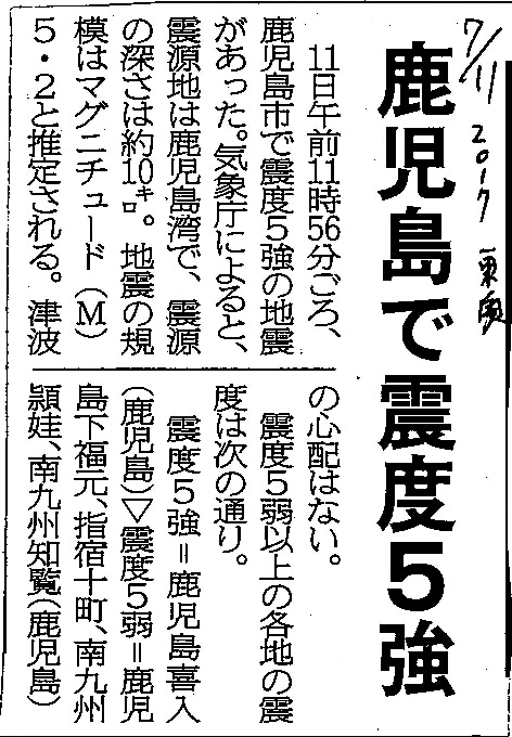 [2017_07_11_04]鹿児島で震度5強(東奥日報2017年7月11日)