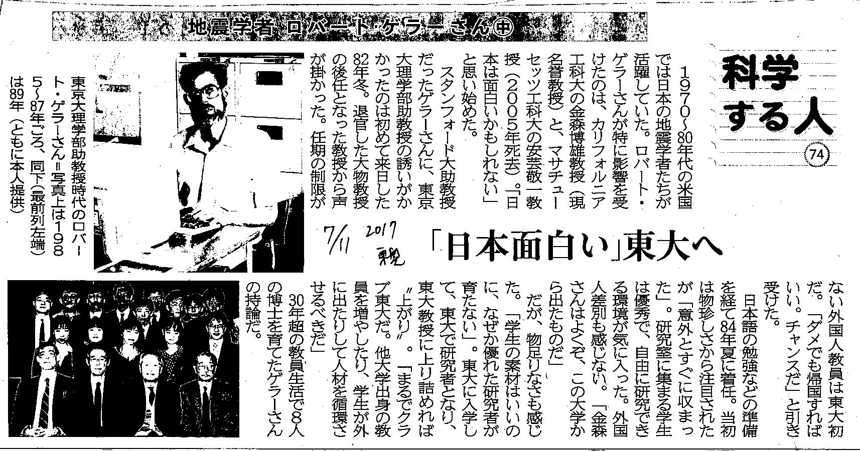 [2017_07_11_05]科学する人74 地震学者ロバート・ゲラーさん(中) 「日本面白い」東大へ(東奥日報2017年7月11日)