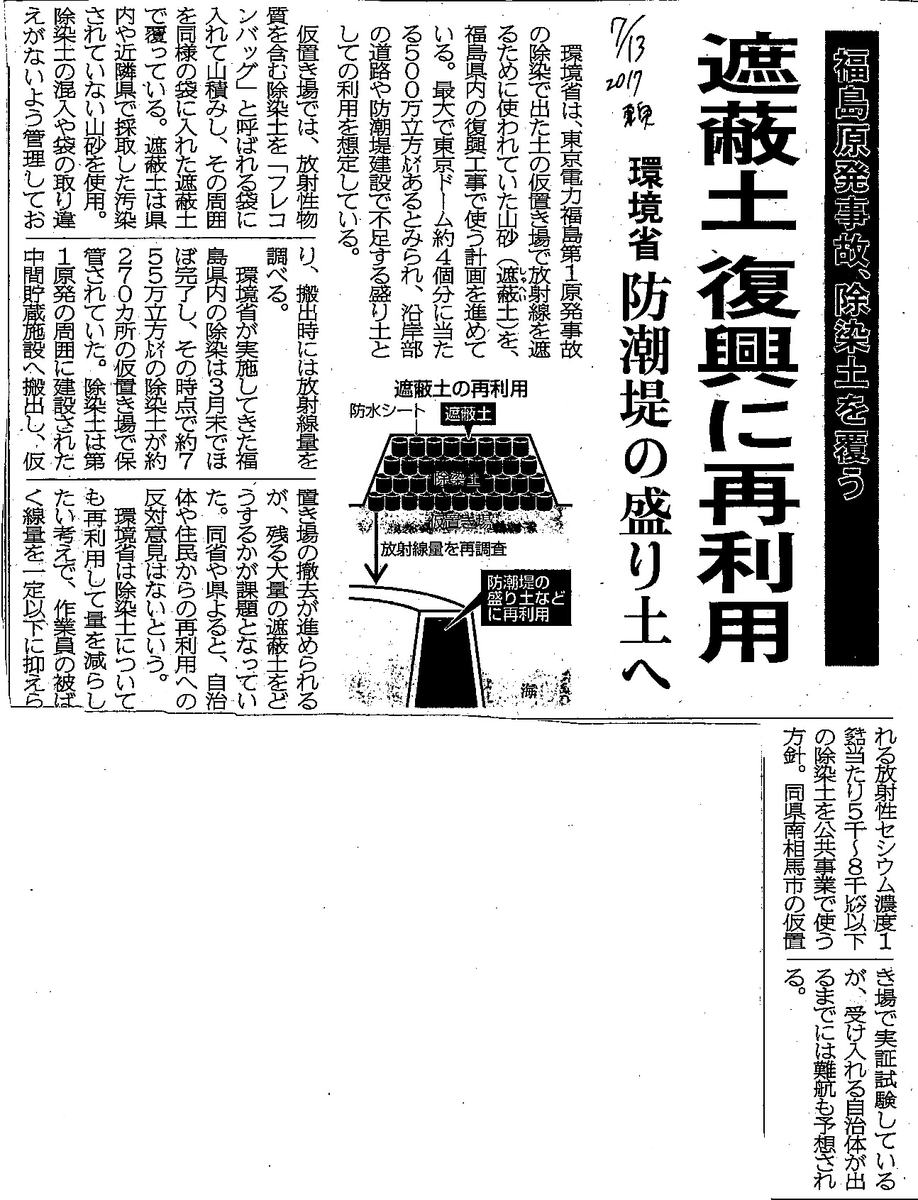 [2017_07_13_04]福島原発事故、除染土を覆う 遮蔽土 復興に再利用 環境省 防潮堤の盛り土へ(東奥日報2017年7月13日)