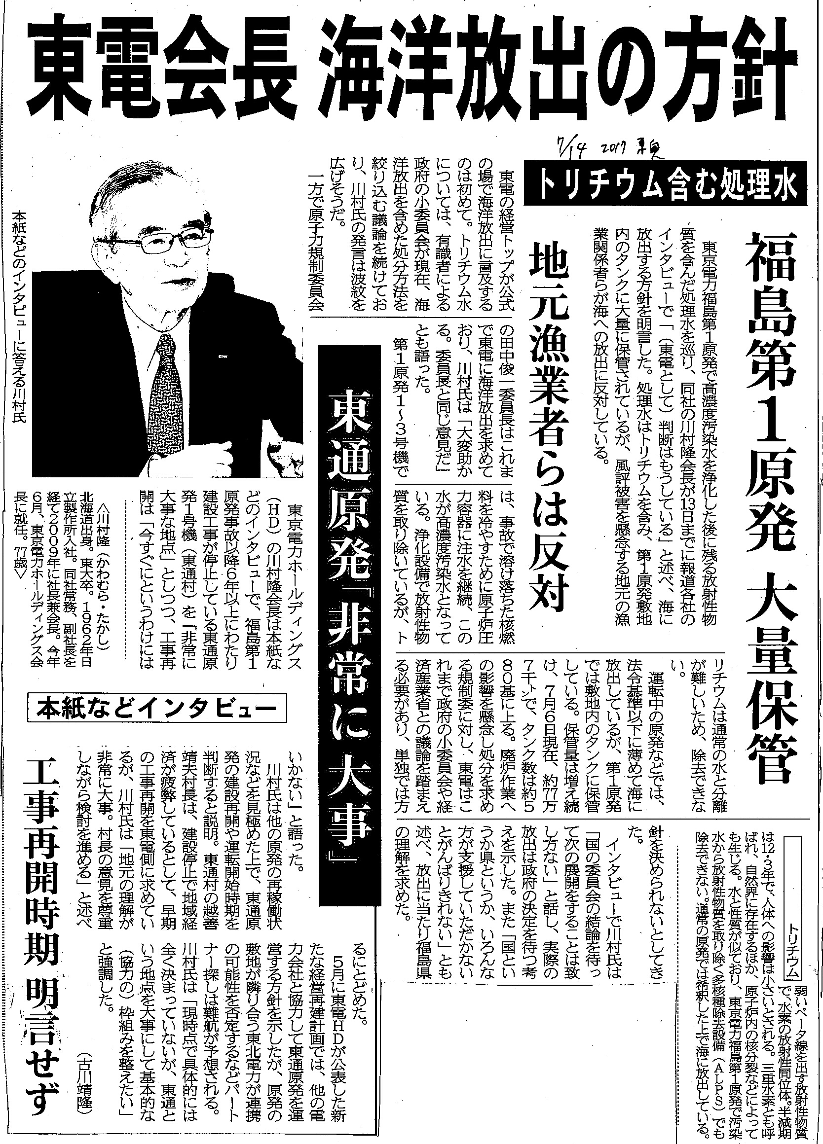 | [2017_07_14_01]東電会長 海洋放出の方針 トリチウム含む処理水 福島第1原発 大量保管 地元漁業者らは反対 東通原発「非常に大事」 本紙などインタビュー 工事再開時期 明言せず(東奥日報2017年7月14日) |