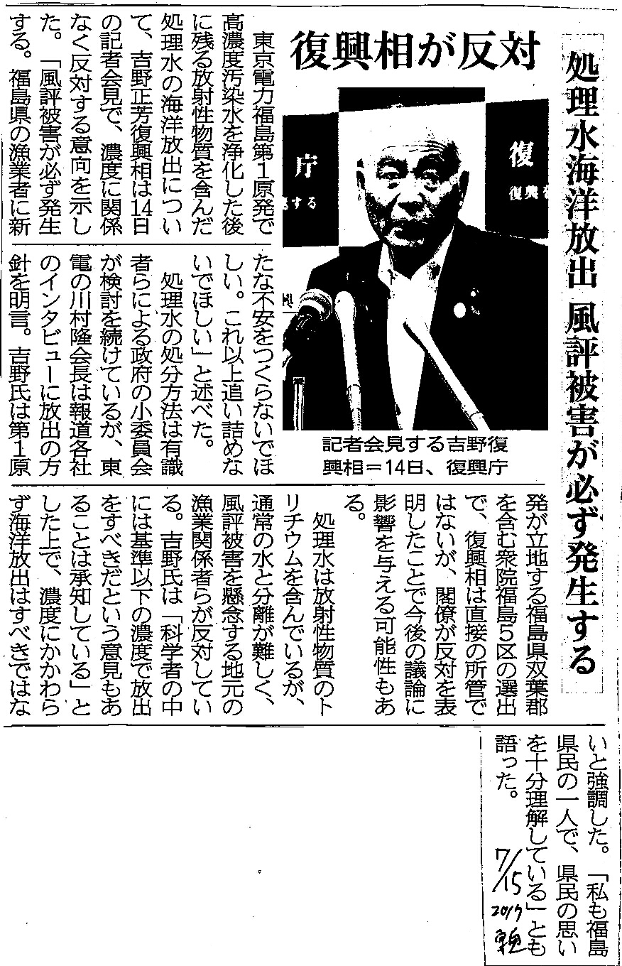 [2017_07_15_06]処理水海洋放出 風評被害が必ず発生する 復興相が反対(東奥日報2017年7月15日)