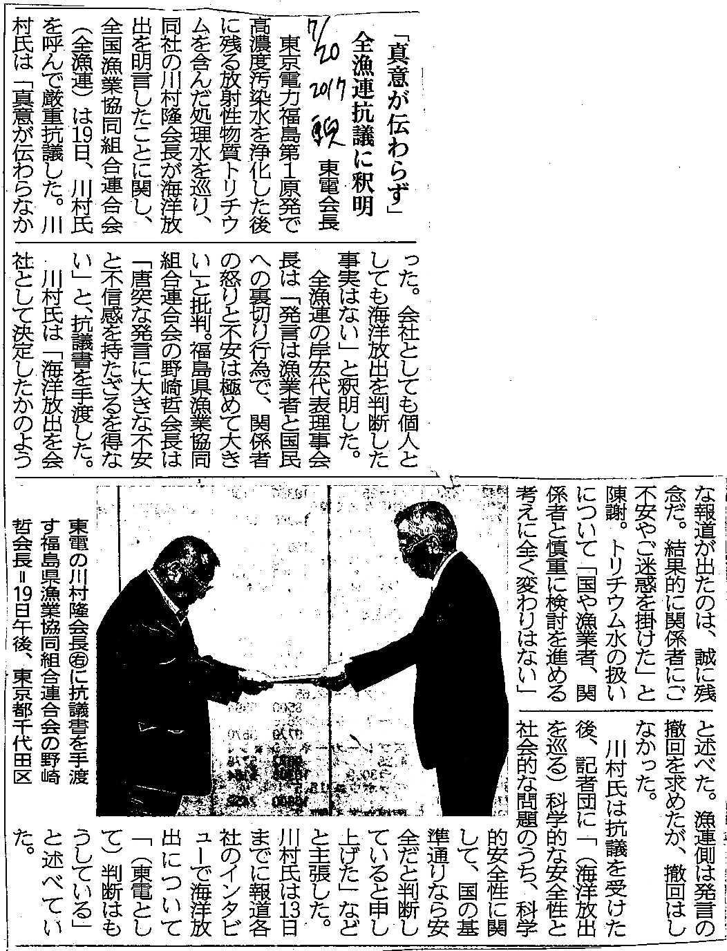 | [2017_07_20_01]「真意が伝わらず」全漁連抗議に釈明 東電会長(東奥日報2017年7月20日) |