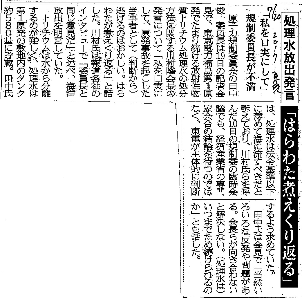 | [2017_07_20_02]処理水放出発言 「はらわた煮えくり返る」 「私を口実にして」規制委員長が不満(東奥日報2017年7月20日) |