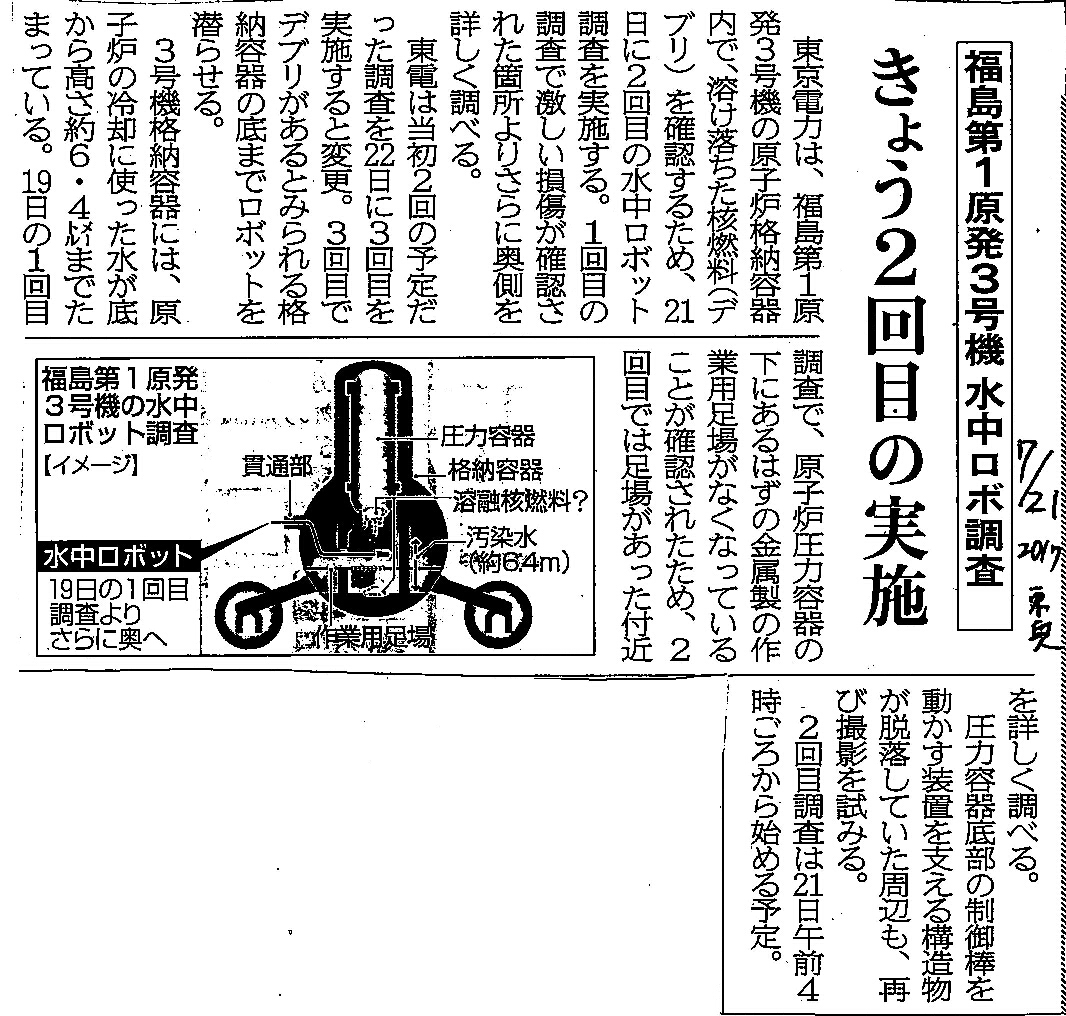 [2017_07_21_01]福島第1原発3号機 水中ロボ調査 きょう2回目の実施(東奥日報2017年7月21日)