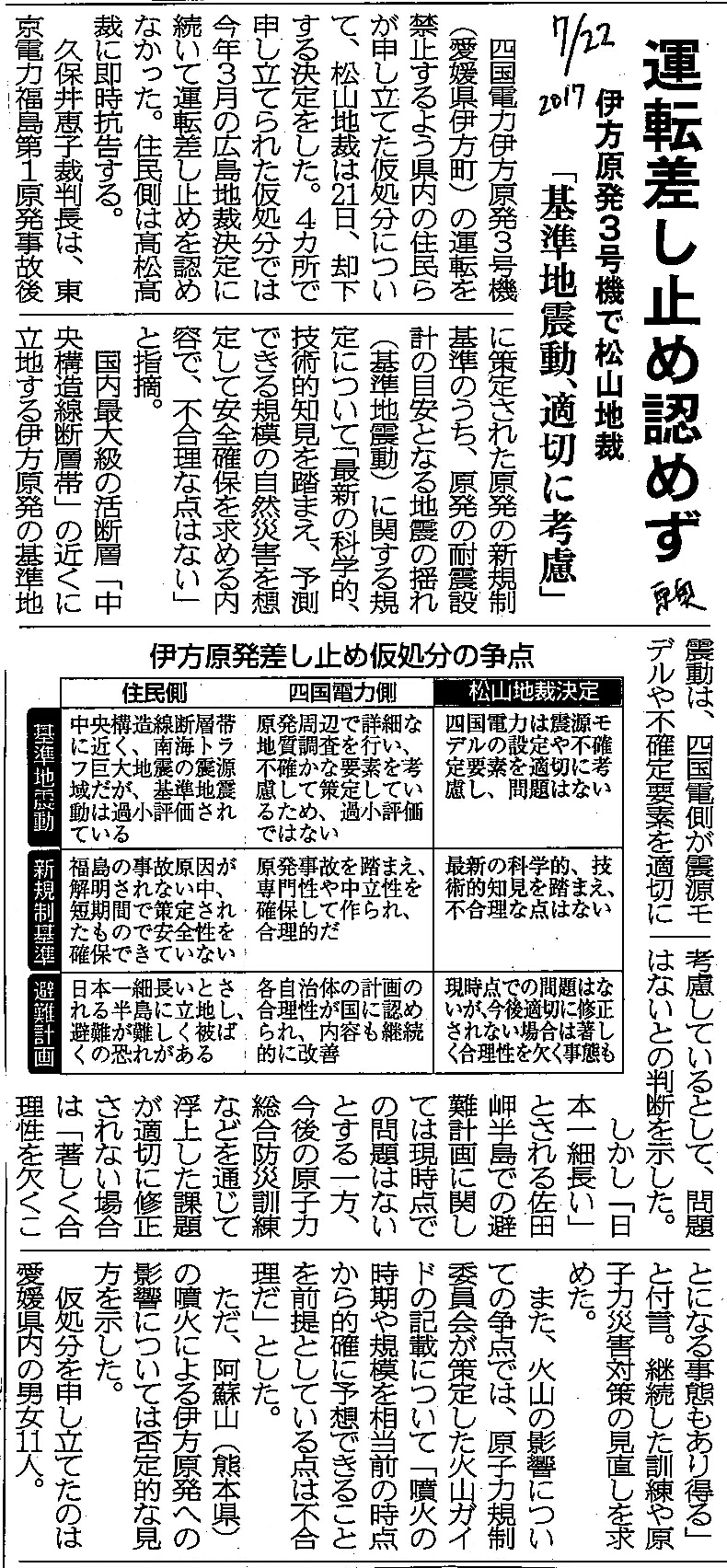 [2017_07_22_01]運転差し止め認めず 伊方原発3号機で松山地裁 「基準地震動、適切に考慮」(東奥日報2017年7月22日)