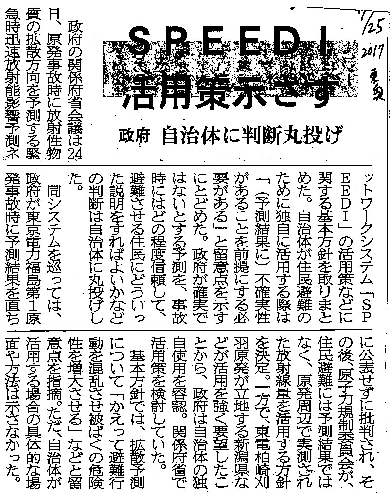 [2017_07_25_01]SPEEDI 活用策示さず 政府 自治体に判断丸投げ(東奥日報2017年7月25日)