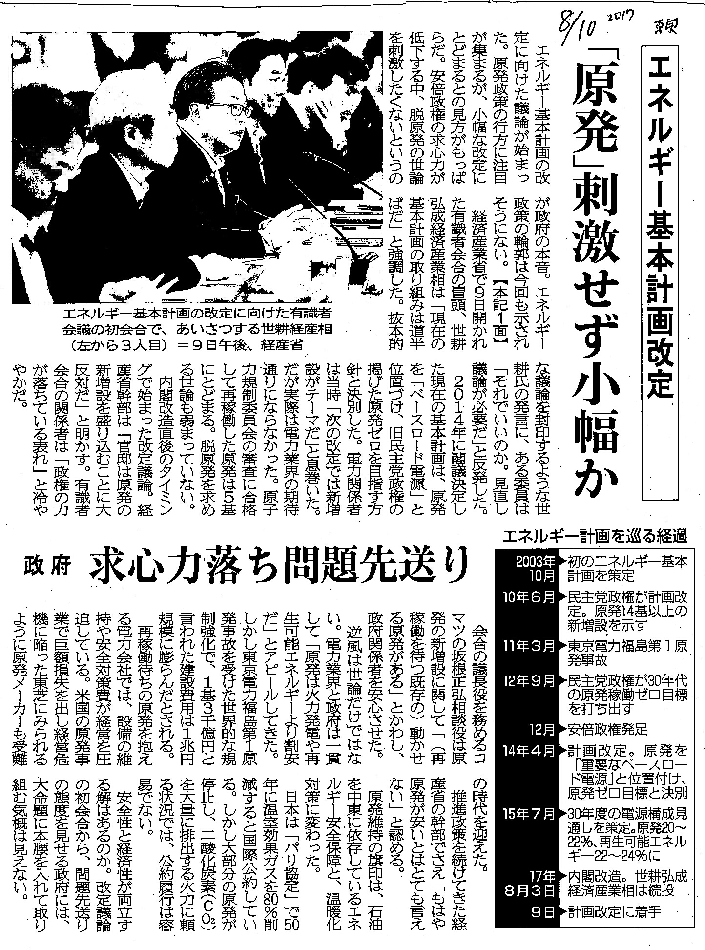 [2017_08_10_02]エネルギー基本計画改定 「原発」刺激せず小幅か 政府 求心力落ち問題先送り(東奥日報2017年8月10日)