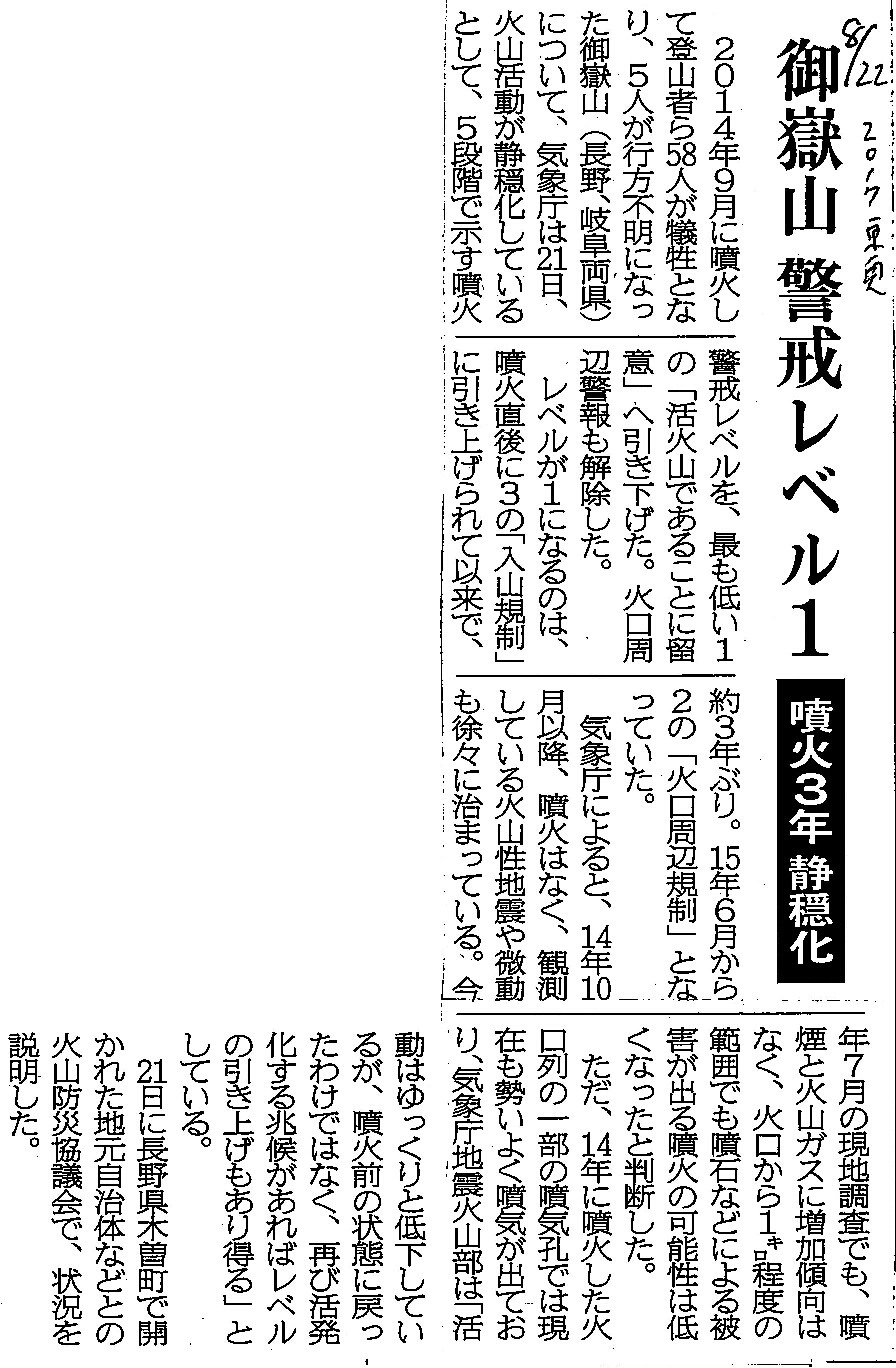 [2017_08_22_02]御嶽山 警戒レベル1 噴火3年 静穏化(東奥日報2017年8月22日)