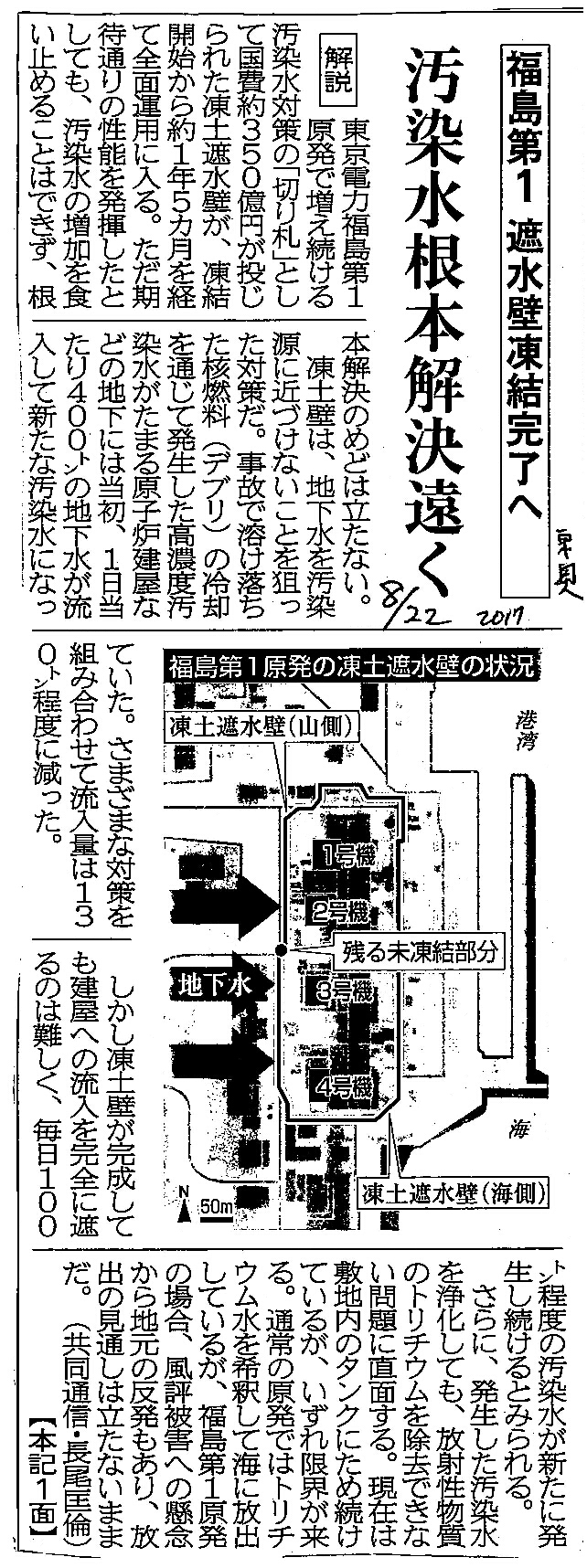 | [2017_08_22_03]福島第1 遮水壁凍結完了へ 汚染水根本解決遠のく(東奥日報2017年8月22日) |