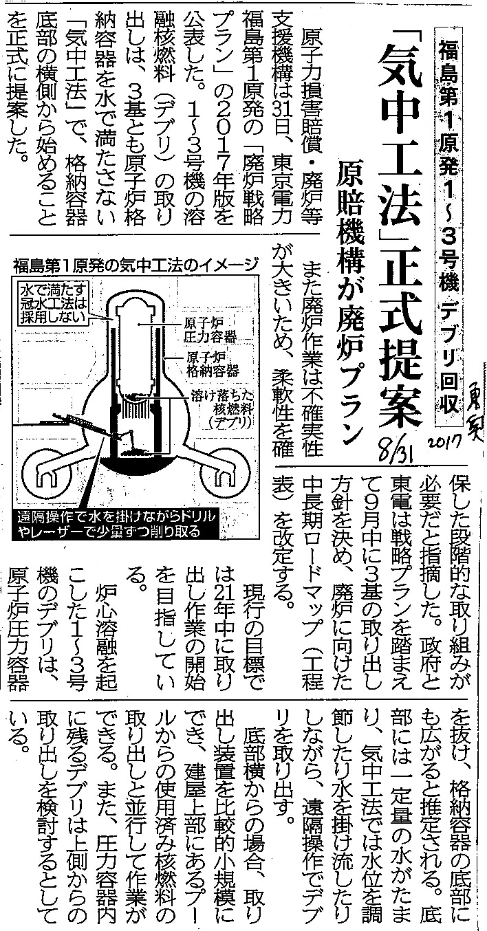 [2017_08_31_02]福島第1原発1〜3号機 デブリ回収 「気中工法」正式提案 原賠機構が廃炉プラン(東奥日報2017年8月31日)