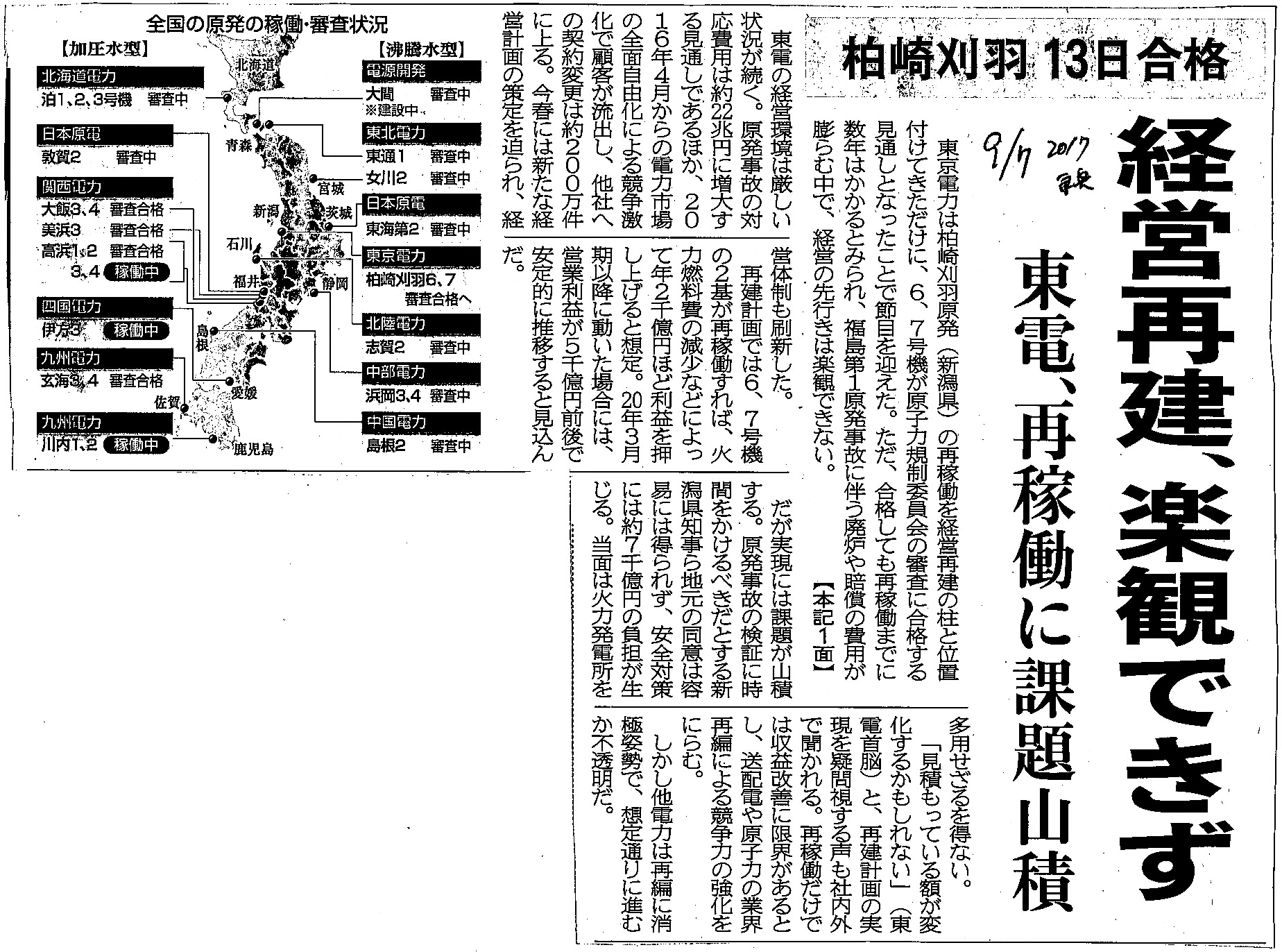 [2017_09_07_04]柏崎刈羽 13日合格 経営再建、楽観できず 東電、再稼働に課題山積(東奥日報2017年9月7日)