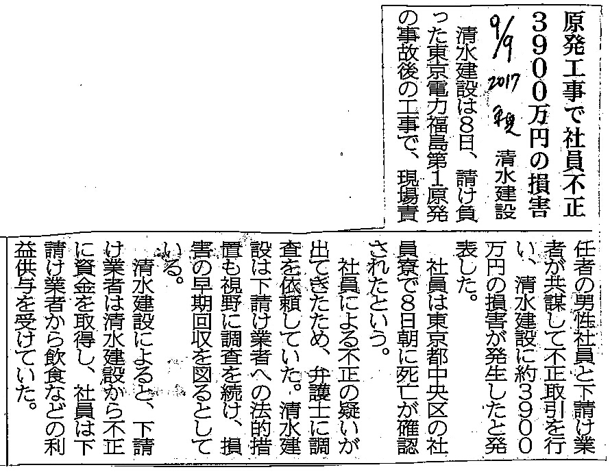 [2017_09_09_02]原発工事で社員不正 3900万円の損害 清水建設(東奥日報2017年9月9日)