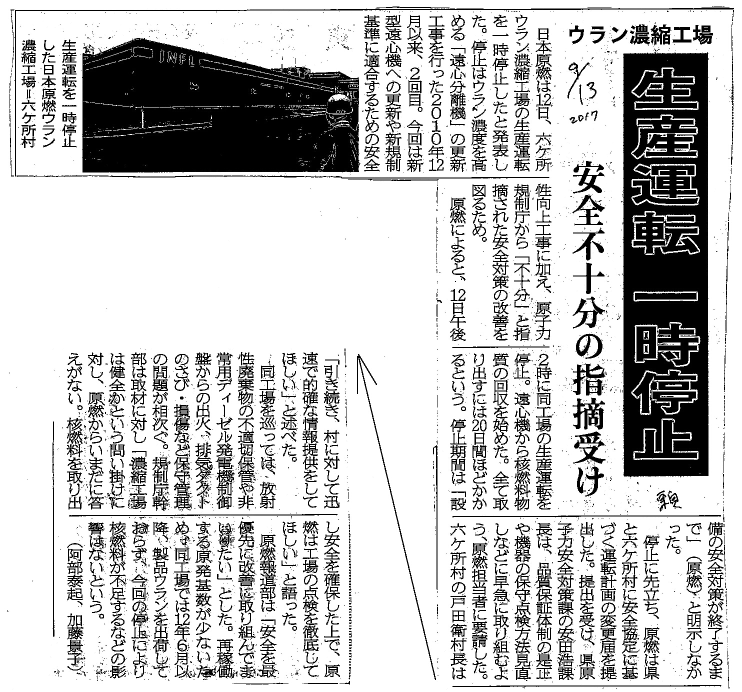 | [2017_09_13_03]ウラン濃縮工場 生産運転一時停止 安全不十分の指摘受け(東奥日報2017年9月13日) |
