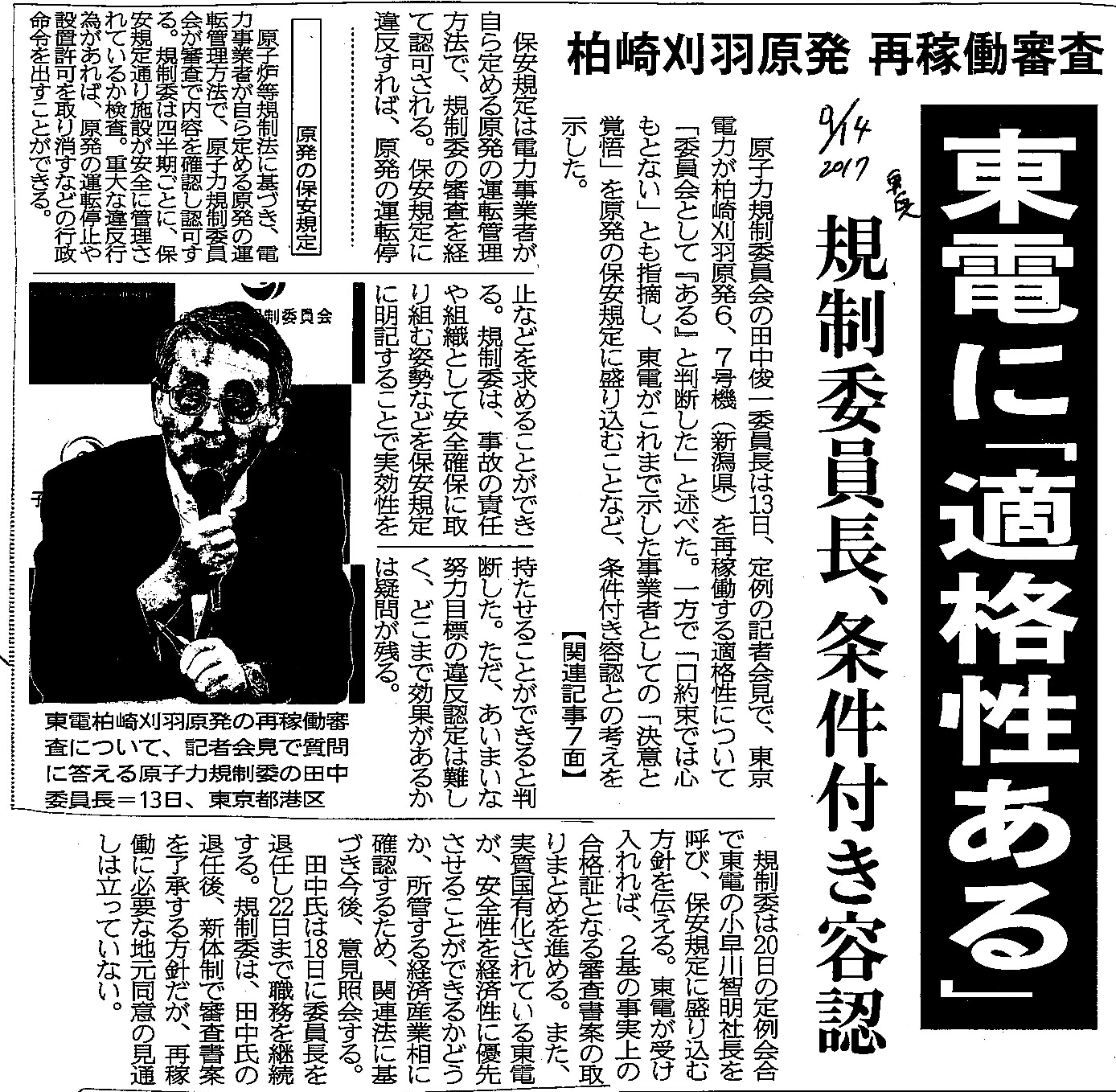 [2017_09_14_02]柏崎刈羽原発 再稼働審査 東電に「適格性ある」 規制委員長、条件つき容認(東奥日報2017年9月14日)
