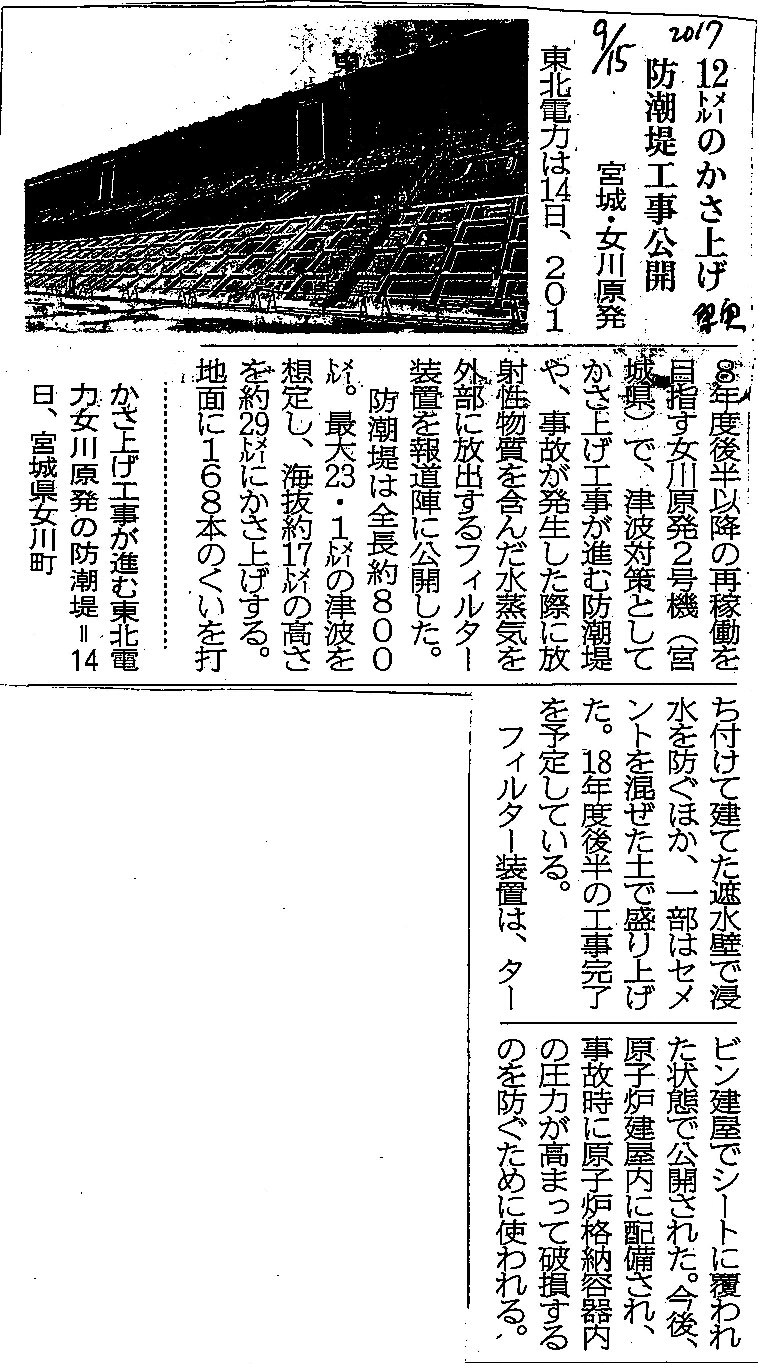 | [2017_09_15_02]12メートルのかさ上げ防潮堤工事公開 宮城・女川原発(東奥日報2017年9月15日) |