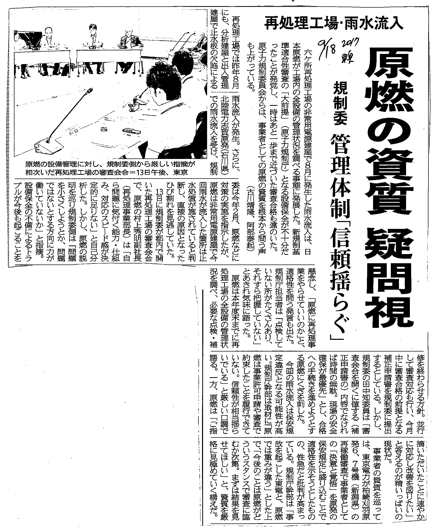 | [2017_09_18_01]再処理工場・雨水流入 原燃の資質 疑問視 規制委 管理体制「信頼揺らぐ」(東奥日報2017年9月18日) |