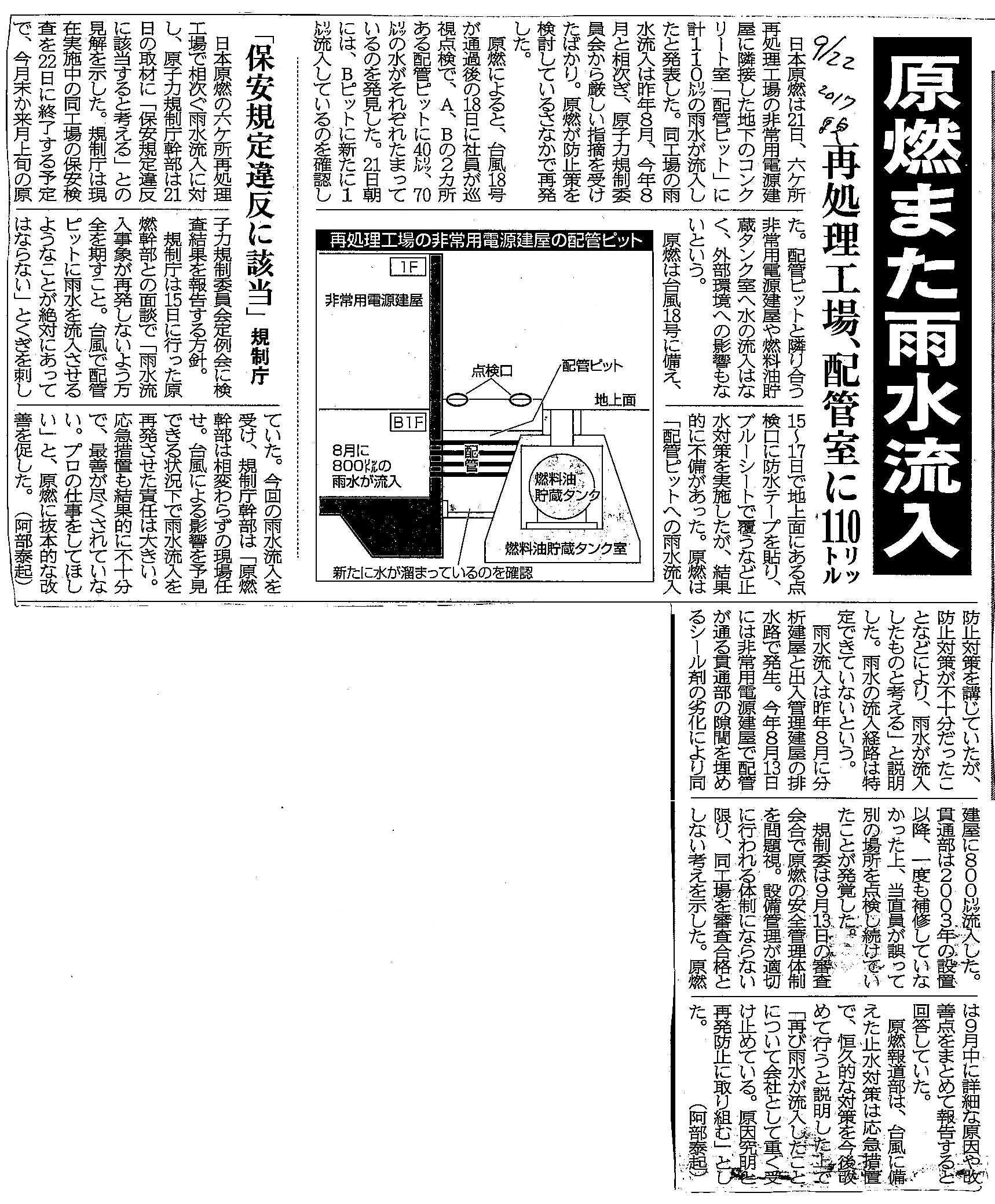 | [2017_09_22_01]原燃また雨水流入 再処理工場、配管室に110リットル 「保安規定違反に該当」 規制庁(東奥日報2017年9月22日) |