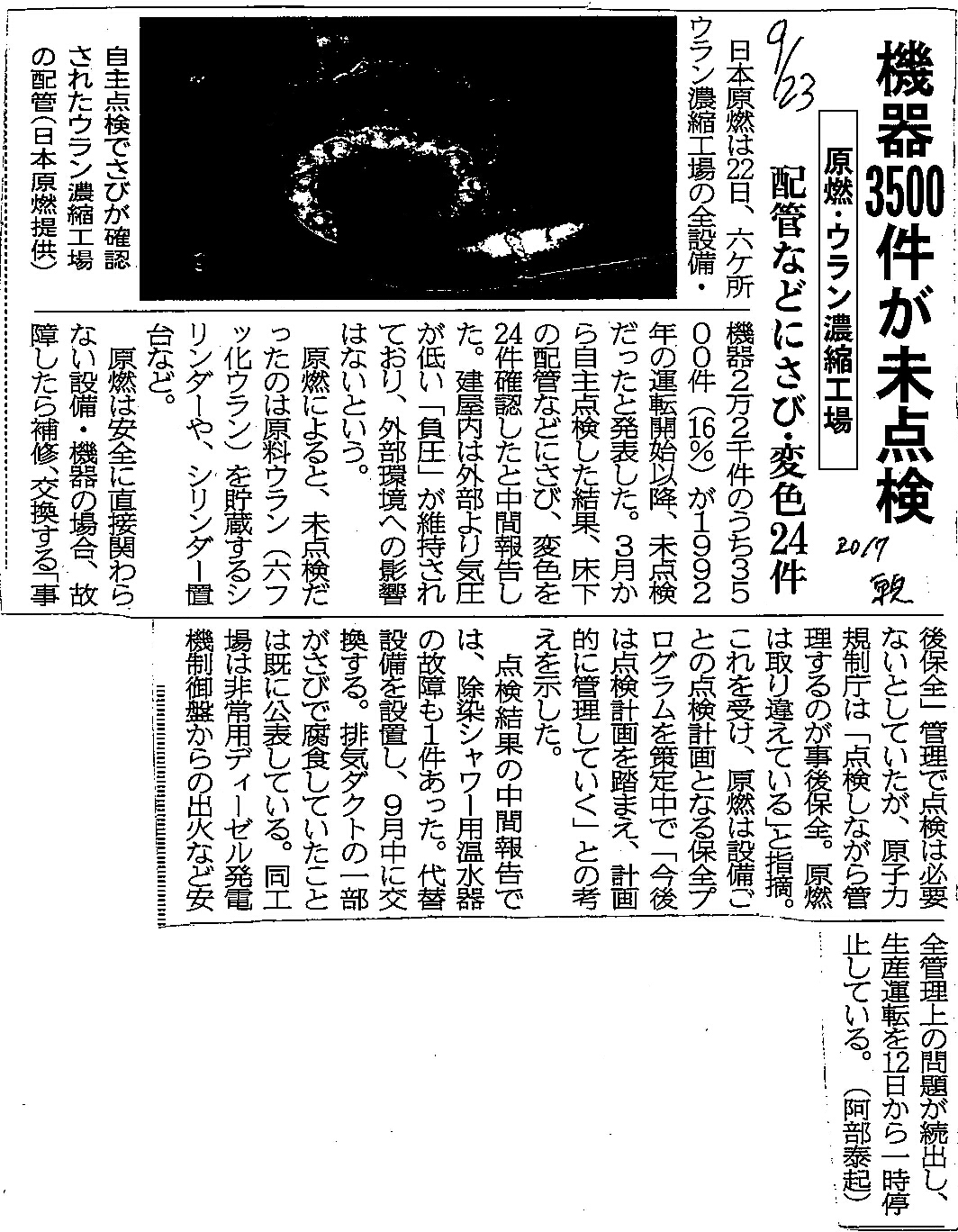 | [2017_09_23_02]機器3500件が未点検 原燃・ウラン濃縮工場 配管などにさび・変色24件(東奥日報2017年9月23日) |