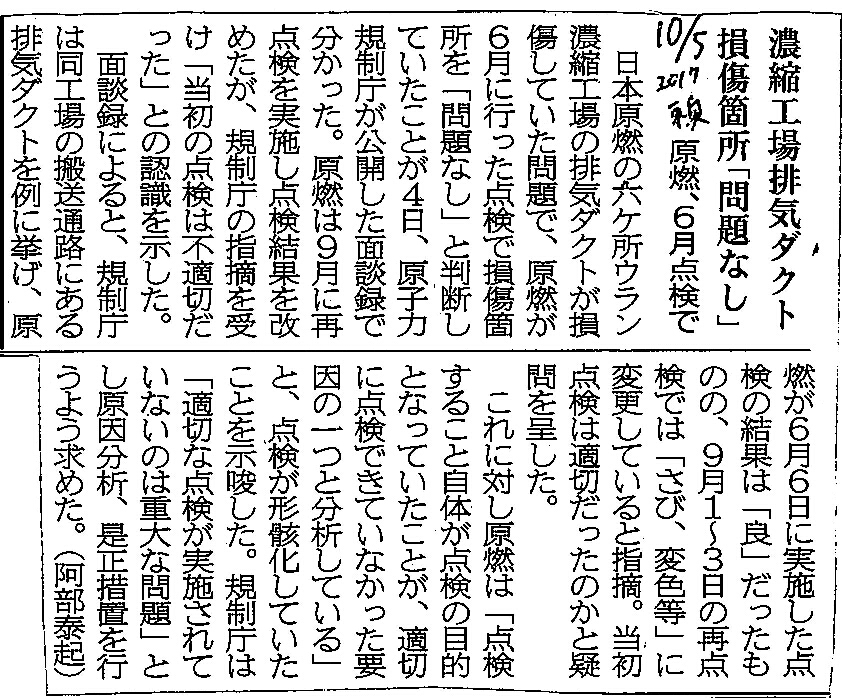 | [2017_10_05_01]濃縮工場排気ダクト損傷箇所「問題なし」 原燃、6月点検で(東奥日報2017年10月5日) |