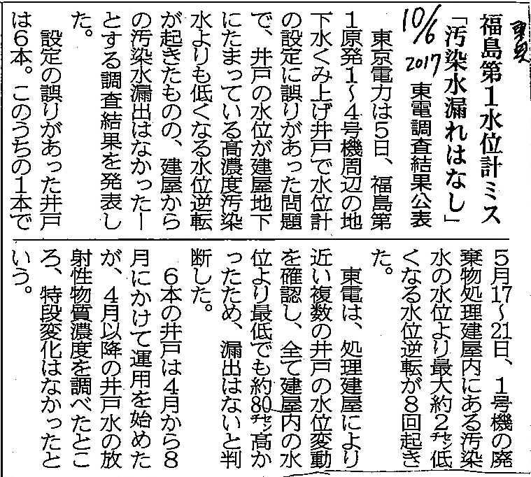 | [2017_10_06_01]福島第1水位計ミス 「汚染水漏れはなし」 東電調査結果公表(東奥日報2017年10月6日) |