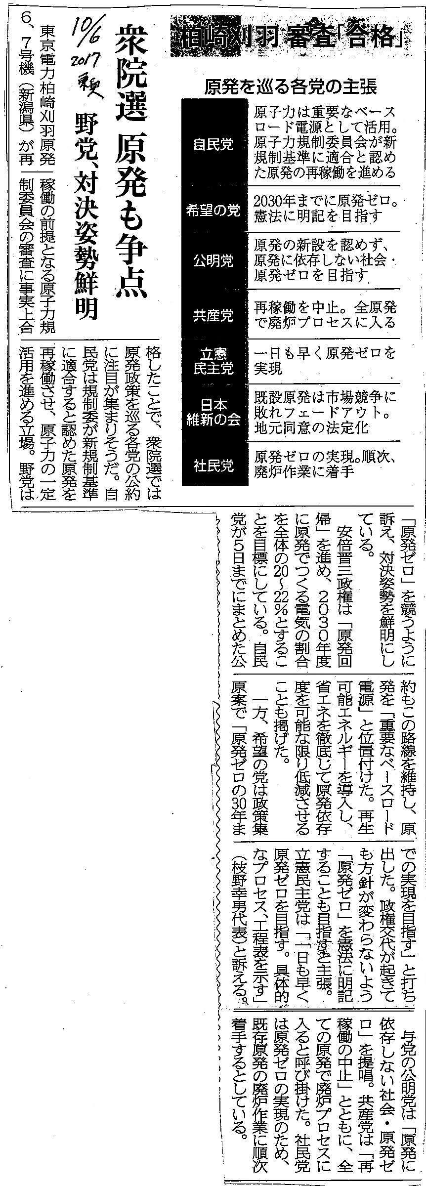 [2017_10_06_02]柏崎刈羽審査「合格」 衆院選 原発も争点 野党、対決姿勢鮮明(東奥日報2017年10月6日)