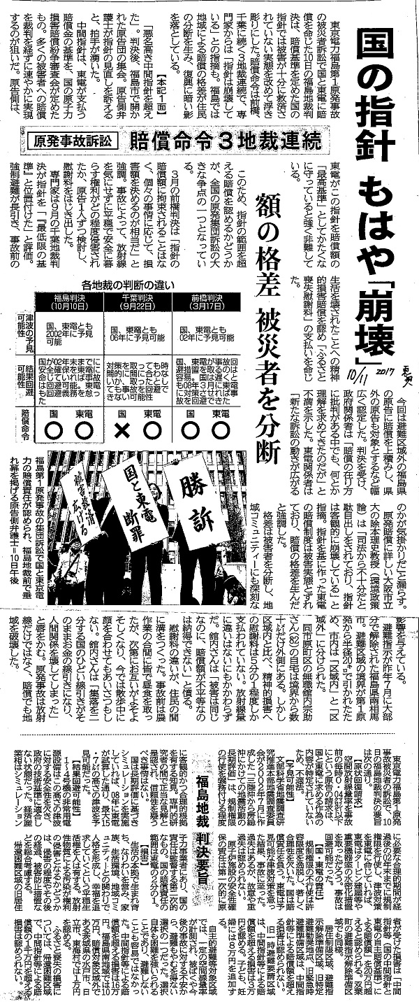 | [2017_10_11_01]国の指針 もはや「崩壊」 原発事故訴訟 賠償命令3地裁連続 額の格差 被災者を分断 各地裁の判断の違い 福島判決(10月10日) 千葉判決(9月22日) 前橋判決(3月17日) 福島地裁 判決要旨(東奥日報2017年10月11日) |