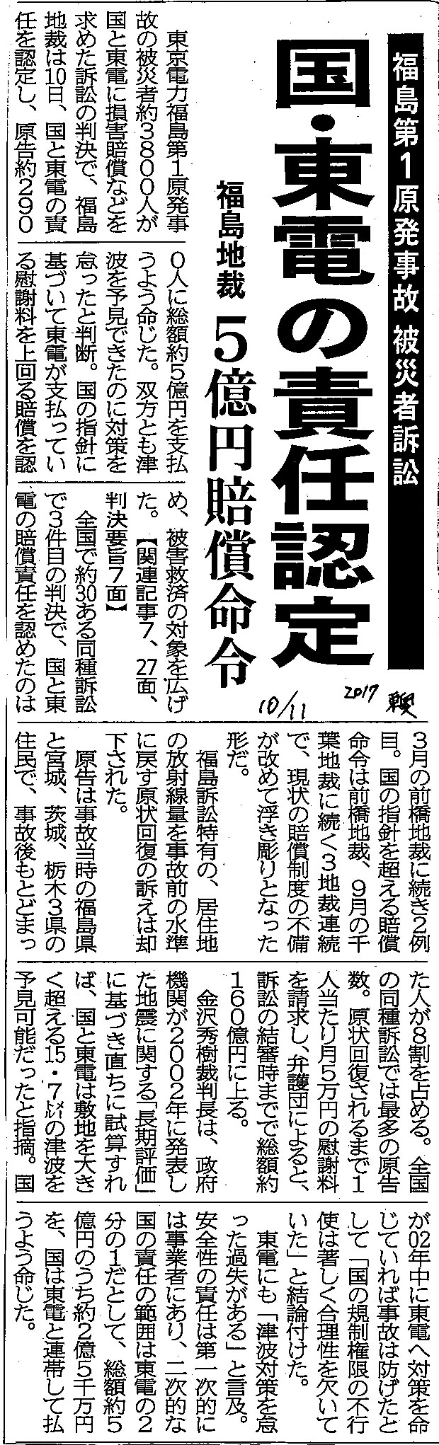 | [2017_10_11_07]福島第1原発事故 被災者訴訟 国・東電の責任認定 福島地裁 5億円賠償命令(東奥日報2017年10月11日) |