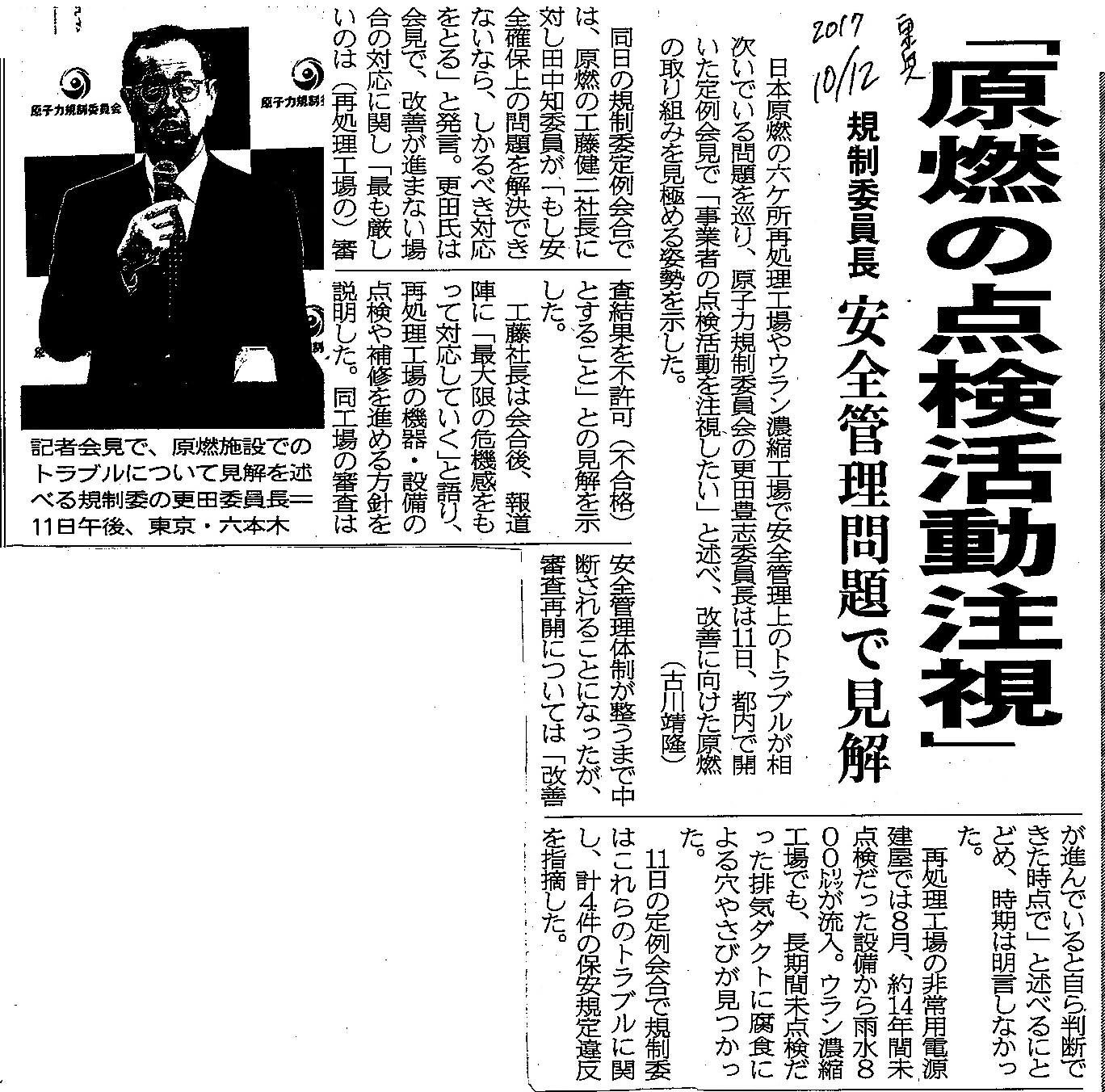| [2017_10_12_01]「原燃の点検活動注視」規制委員長 安全管理問題で見解(東奥日報2017年10月12日) |