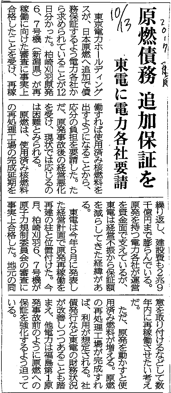 [2017_10_13_02]原燃債務 追加保証を 東電に電力各社要請(東奥日報2017年10月13日)