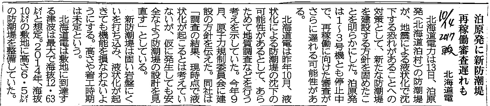 | [2017_10_14_02]泊原発に新防潮堤 再稼働審査遅れも 北海道電(東奥日報2017年10月14日) |