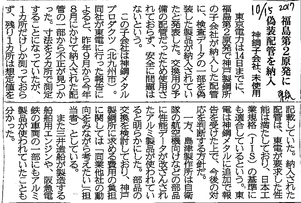 [2017_10_15_01]福島第2原発に偽装配管を納入 神鋼子会社、未使用(東奥日報2017年10月15日)