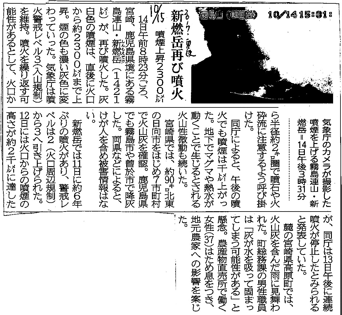 [2017_10_15_02]新燃岳再び噴火 噴煙上昇2300メートル(東奥日報2017年10月15日)