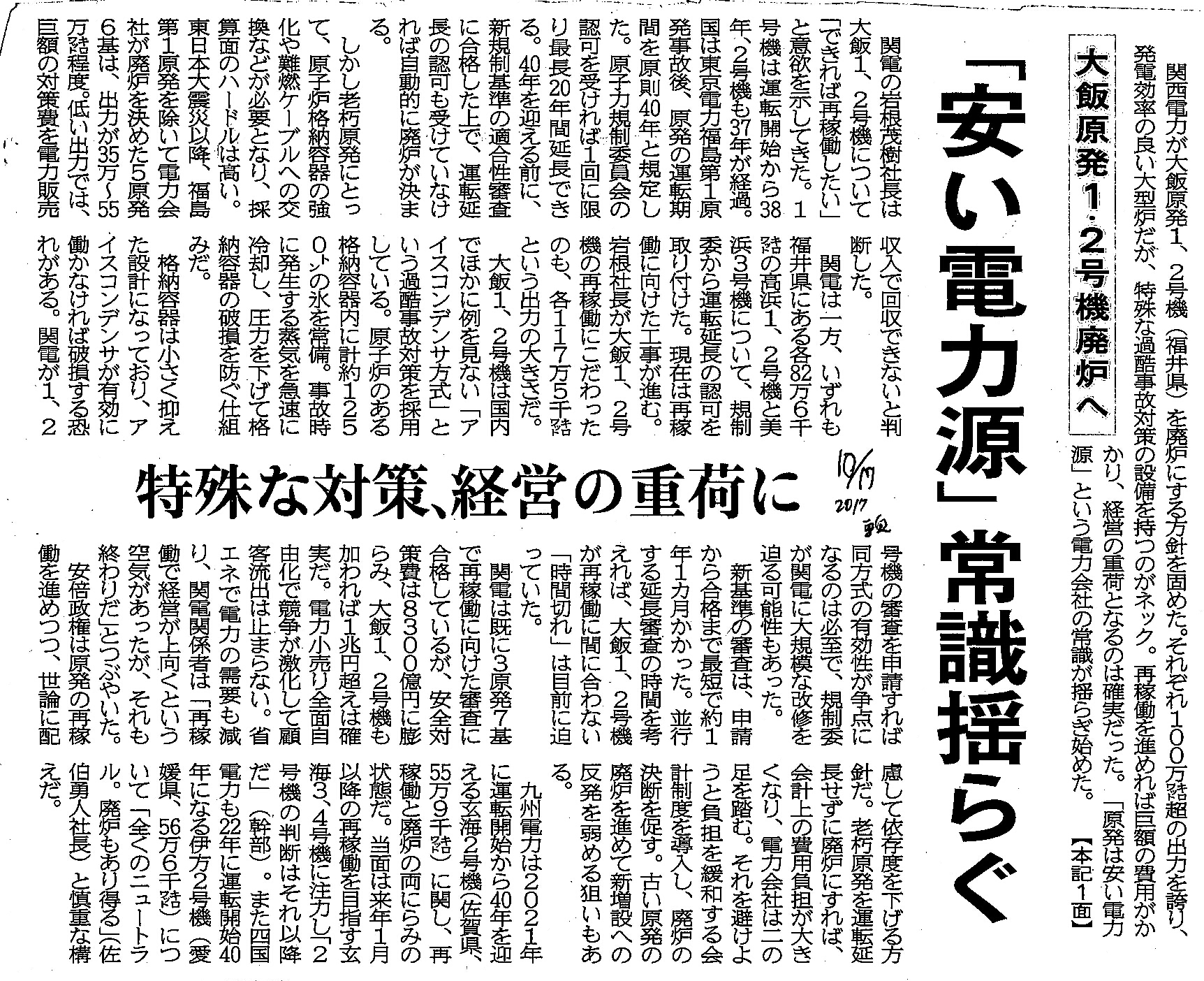 | [2017_10_17_01]大飯原発1・2号機廃炉へ 「安い電力源」常識揺らぐ 特殊な対策、経営の重荷に(東奥日報2017年10月17日) |