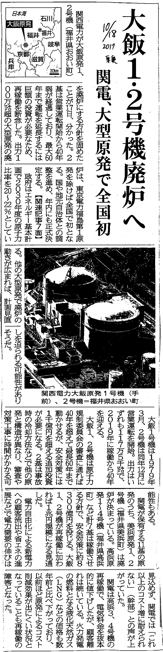 [2017_10_18_03]大飯1・2号機廃炉へ 関電、大型原発で全国初(東奥日報2017年10月18日)