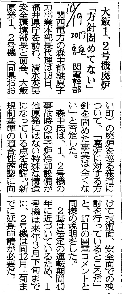 [2017_10_19_01]大飯1,2号機廃炉 「方針固めていない」 関電幹部(東奥日報2017年10月19日)