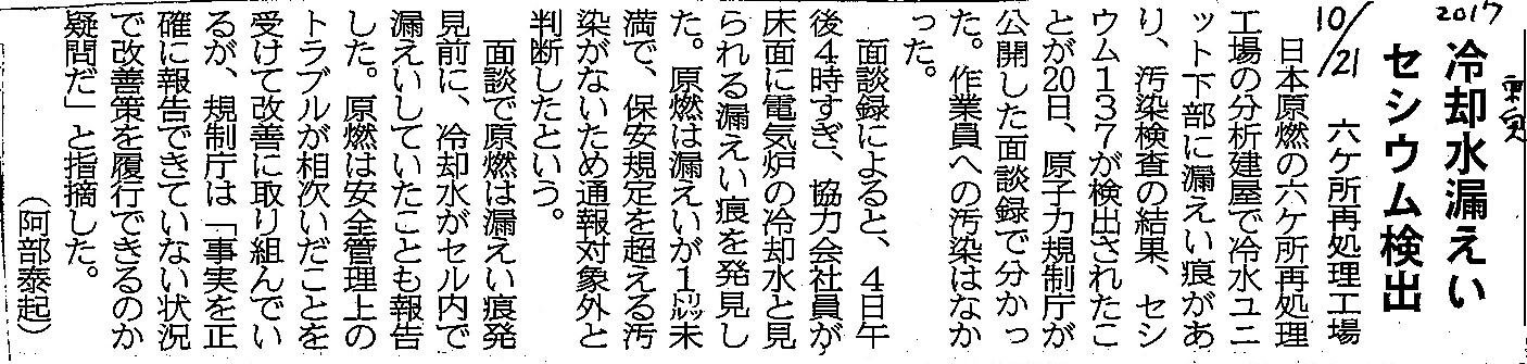 | [2017_10_21_01]冷却水漏えいセシウム検出 六ケ所再処理工場(東奥日報2017年10月21日) |