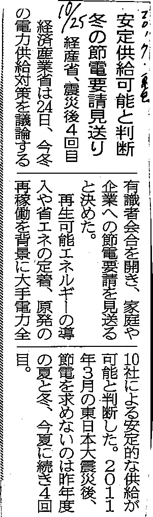 [2017_10_25_01]安定供給可能と判断 冬の節電要請見送り 経産省、震災後4回目(東奥日報2017年10月25日)