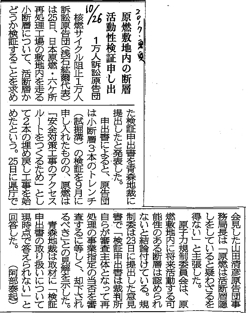 | [2017_10_26_01]原燃敷地内の断層 活動性検証申し出 1万人訴訟原告団(東奥日報2017年10月26日) |