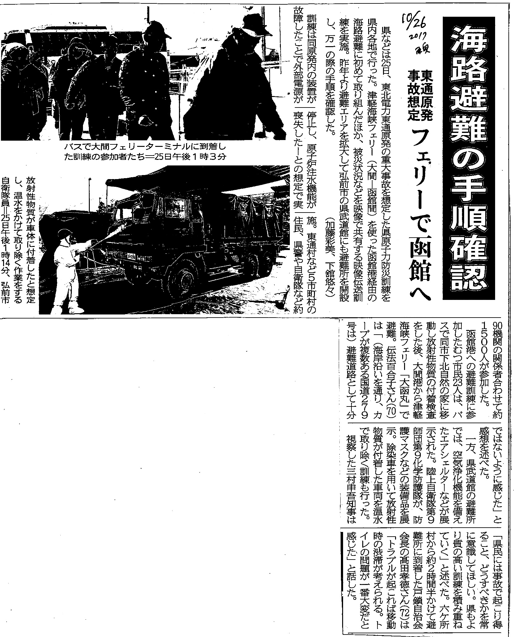 | [2017_10_26_02]海路避難の手順確認 東通原発事故想定 フェリーで函館へ(東奥日報2017年10月26日) |