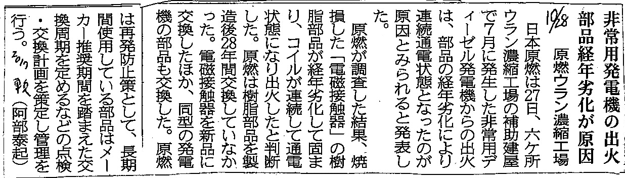 | [2017_10_28_02]非常用発電機の出火 部品経年劣化が原因 原燃ウラン濃縮工場(東奥日報2017年10月28日) |
